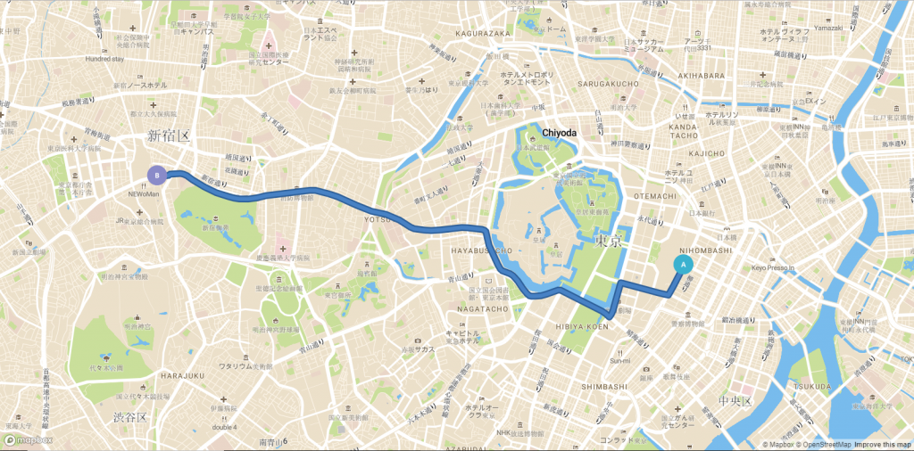 東京駅から新宿駅までのルートを検索するリクエスト